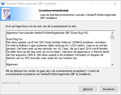 Installeer de Nedsoft RittenRegistratie GBF Update, en volg de installatie stappen.