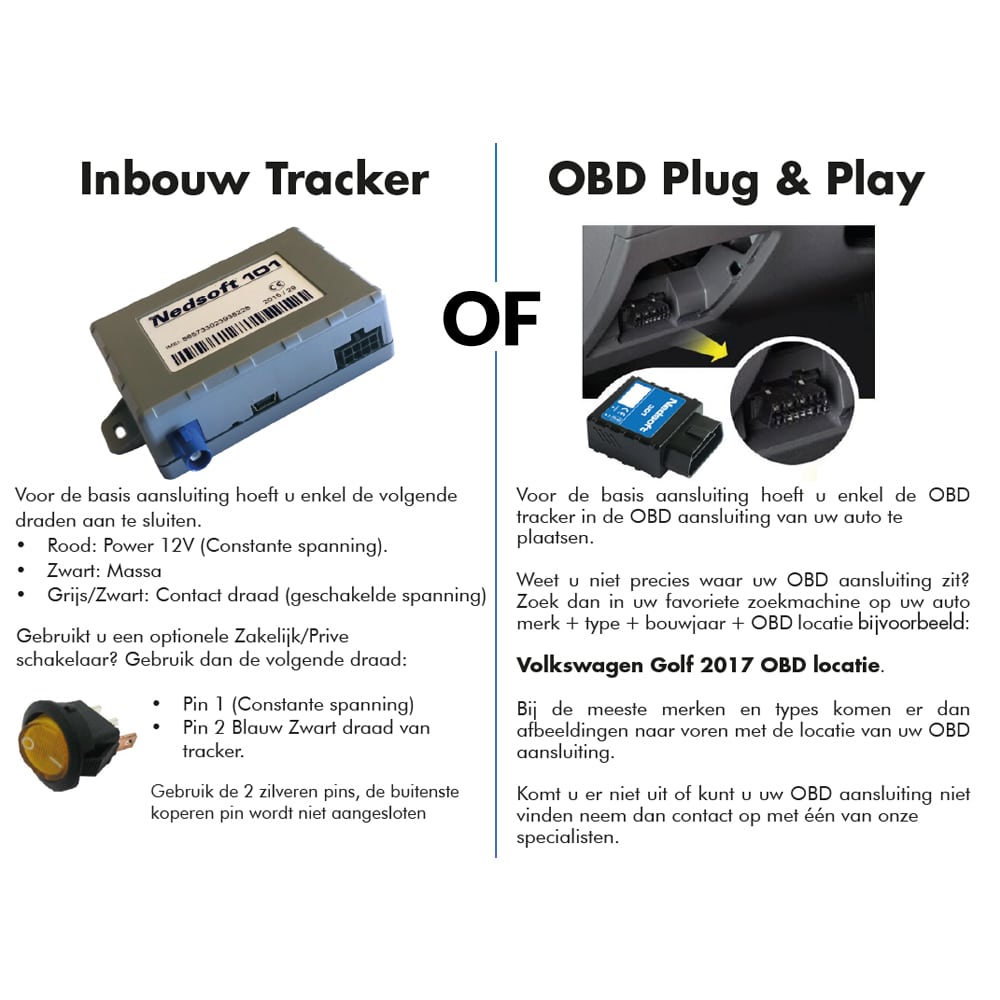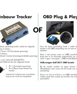 U kunt bij ons de keuze maken uit een Plug & Play tracker of een Professionele inbouw tracker. Elke auto vanaf bouwjaar 1996 heeft een OBD (On Board Diagnostic) aansluiting. Het is een aansluiting waarmee je met de auto kan communiceren. Wanneer u kiest voor een OBD tracker hoef je dus enkel de tracker in de aansluiting te steken en tracker begint gelijk met registreren. Plug & Play dus. Het werkt erg makkelijk en is voor iedereen te doen. Het is hierdoor ook mogelijk om de tracker tussen verschillende voertuigen uit te wisselen. Heeft u liever een tracker die netjes ingebouwd kan worden in het dashboard van uw voertuig? Kies dan voor de professionele inbouw tracker. De tracker dient aangesloten te worden op de voeding van uw voertuig. Na inbouw van de tracker zal er niets meer te zien zijn van de apparatuur. Dit maakt sabotage ook veel lastiger t.o.v. een Plug & Play tracker.
