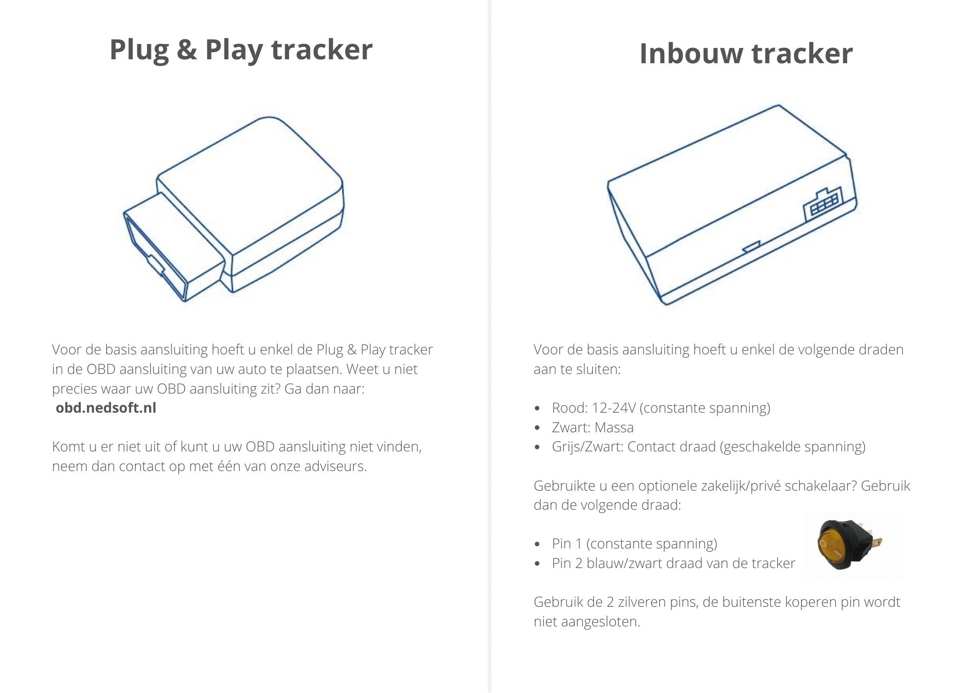 Nedsoft Ritten Registratie Plus werkt met een Plug & Play of inbouw tracker. De Plug & Play tracker is eenvoudig in te pluggen door de stappen uit de installatie wizard te doorlopen. Liever de zekerheid van een ingebouwde tracker? Ook dat is mogelijk, je kunt deze zelf of door ons laten inbouwen.